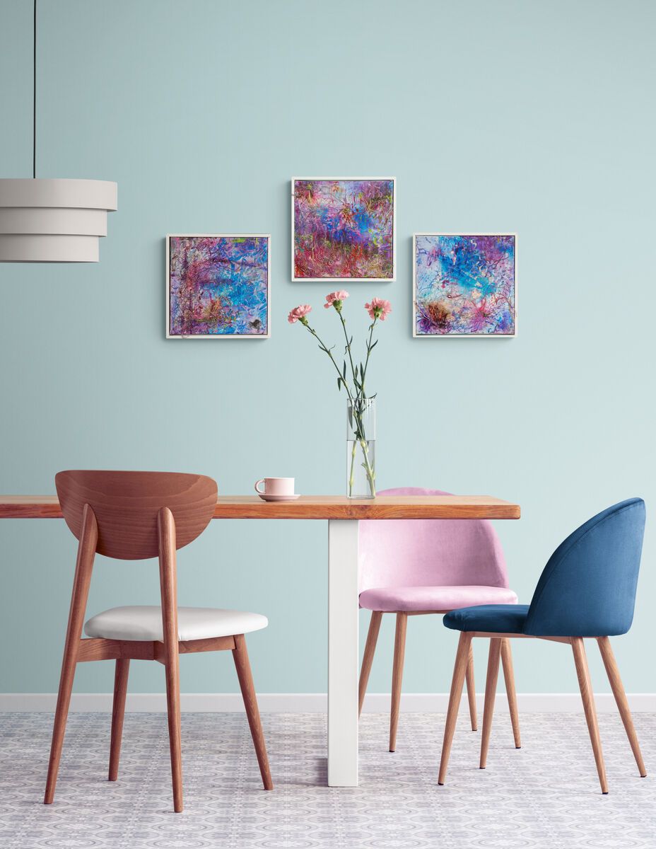 3 of a set of 12 30x30 cm acrylic-based mixed-media gallery-wrapped canvases which we have exhibited together and called "The Boardwalk" (after one of our favourite walks). Seen here framed so each one approximately 32 x 32 cms. Available individually or as a set.