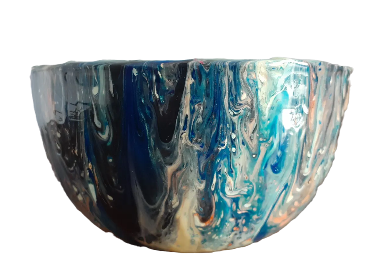 This 10" circular tray is made with mica powders mixed in the epoxy resin, then set the polished chrome handles in place. Final coat of clear epoxy added after the first coat was cured. Because the epoxy resin is food safe, you can use this as a dessert, a cracker, cheese and meat tray or whatever you can think of. NOTE: DO NOT use a knife to cut on this tray or put hot items on, because it could damage the finish. Also, just wash by hand in warm water or use a clothe to clean. Mica powder colors are turquoise, navy blue, light purple and violet. Handles are polished chrome. Colors similar to the 8.5" vase. Unique and cannot be reproduced.
