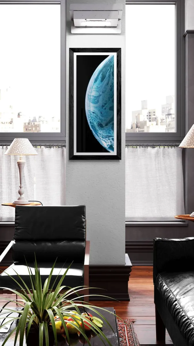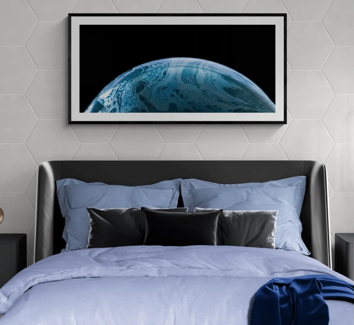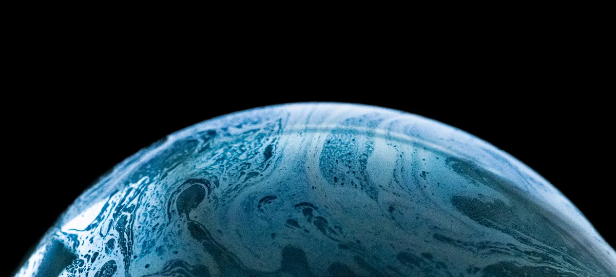 A soap bubble reveals intricate blue and white marbling on its surface. The black background enhances the illusion of a celestial body in space, highlighting the bubble's delicate texture and vivid colors.