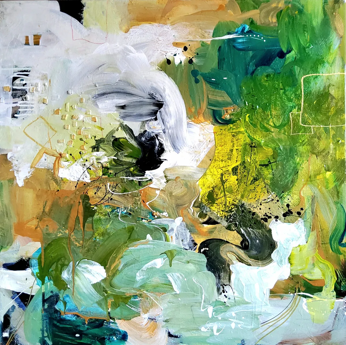 Professionelle malemedier på kvalitetslærred. Et maleri med struktur lavet med teknikken vådt-i-vådt. Også påsat små stykker træflis. Detaljer i guld reflekterer lyset og understreger varmen i maleriet. Kanten er malet sort og kan enten gemmes i en ramme eller fungere som en ramme i sig selv. Signatur i guld