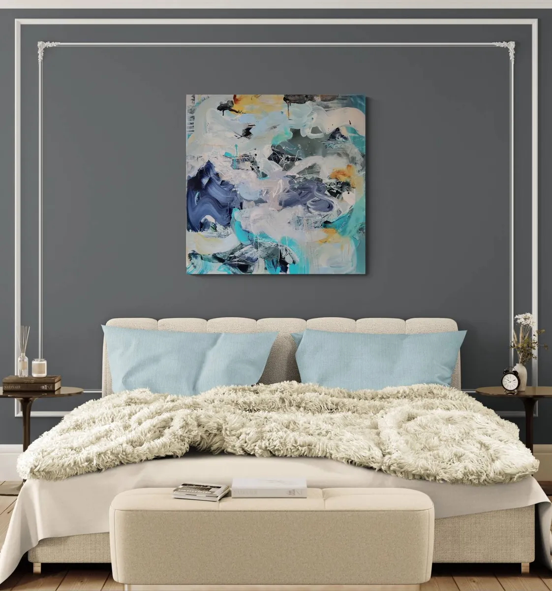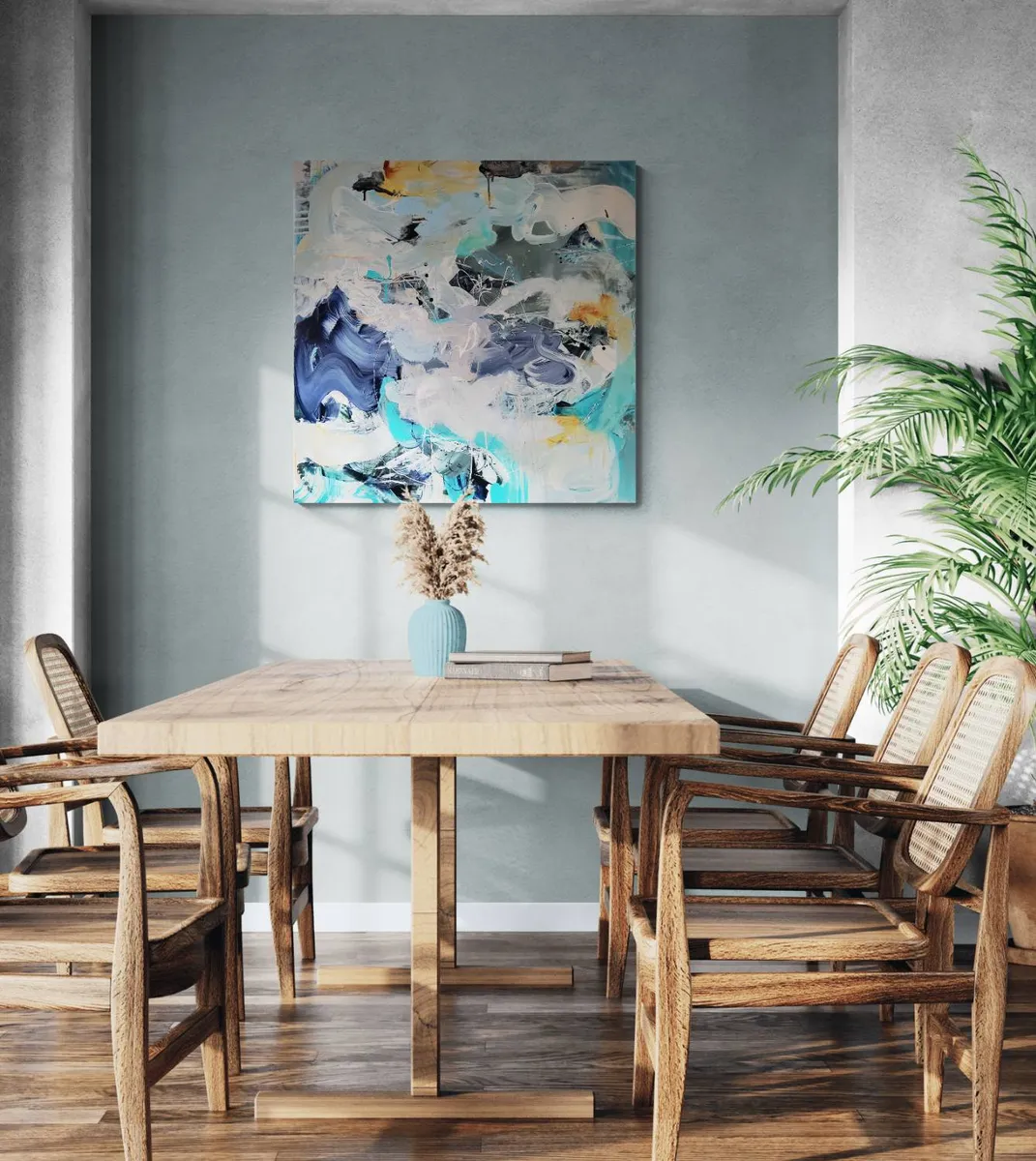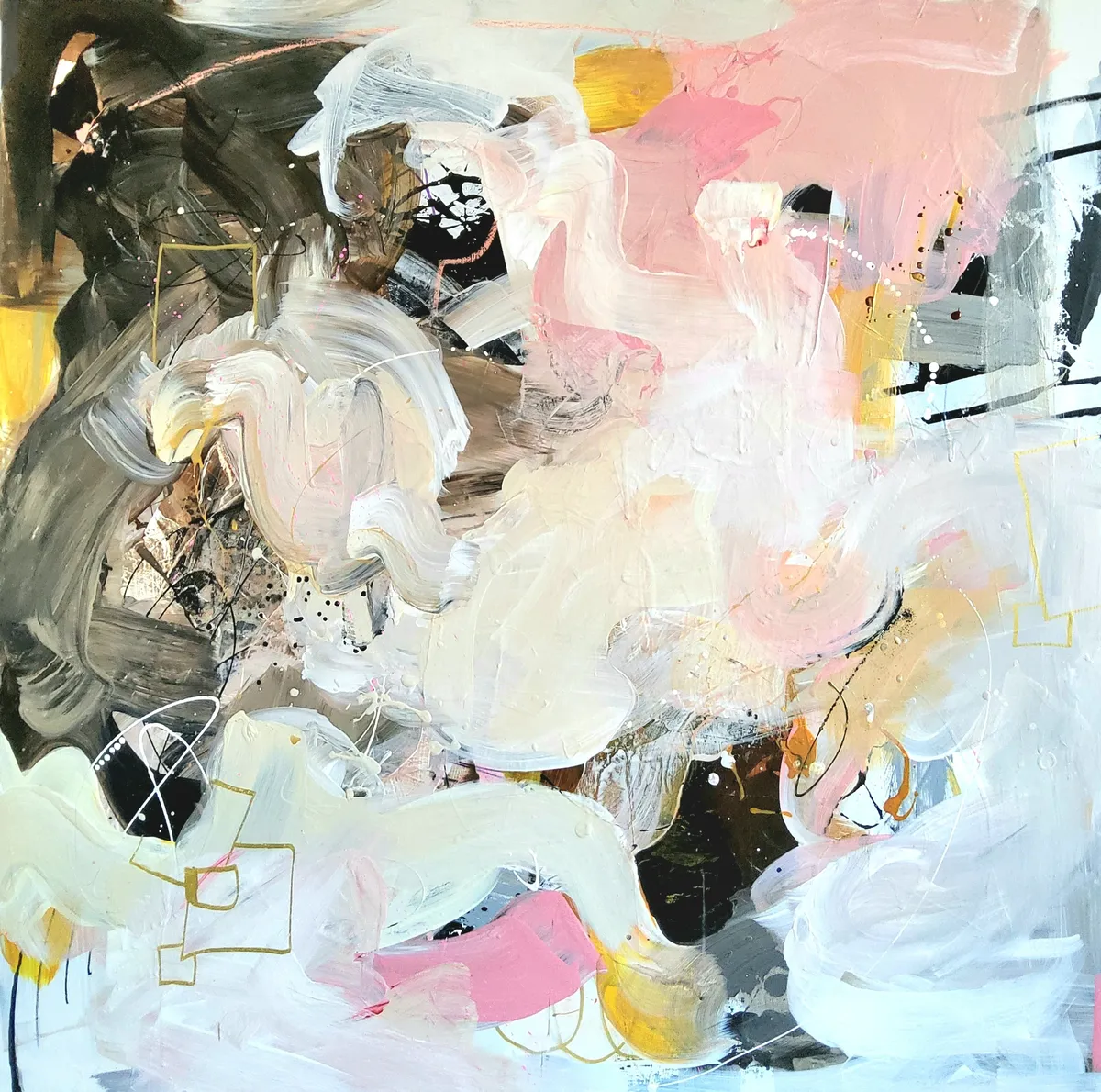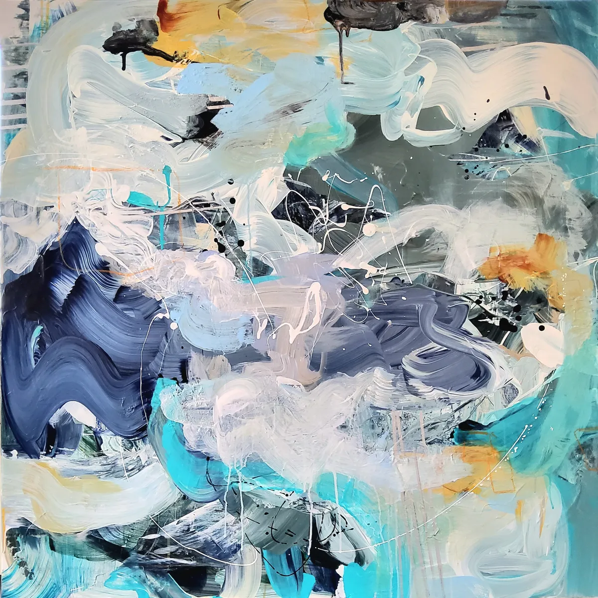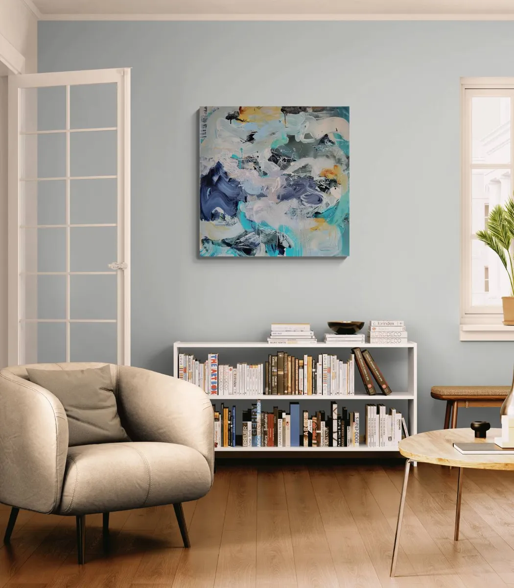 Professionelle malemedier på kvalitetslærred. Et maleri med struktur lavet med collagepapir og teknikkenvådt-i-vådt. Detaljer i sølv reflekterer lyset og understreger det kølige i maleriet. Kanten er malet sort og kan enten gemmes i en ramme eller fungere som en ramme i sig selv. Signatur i guld