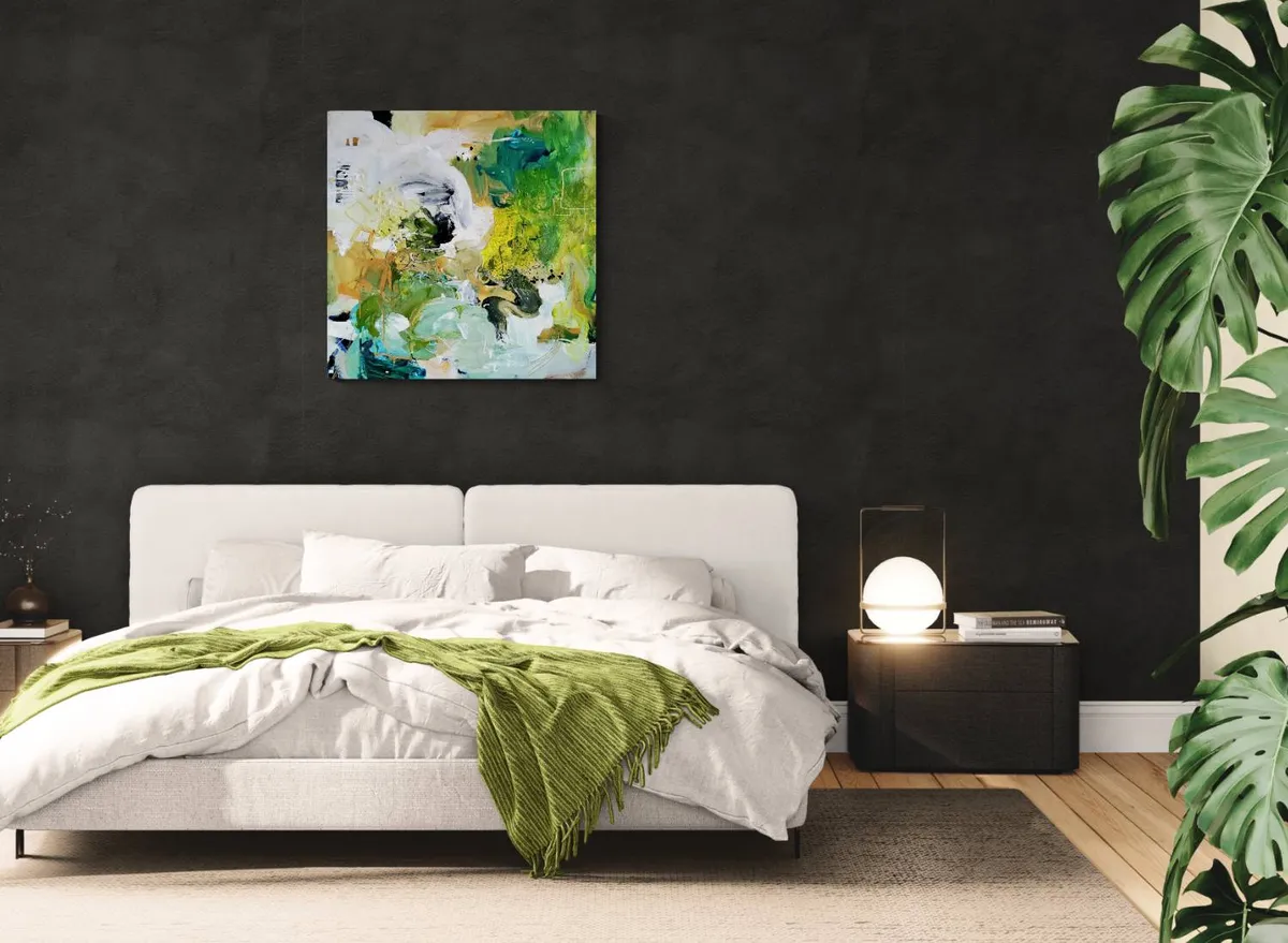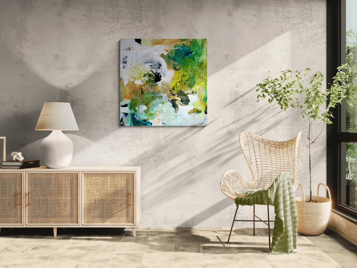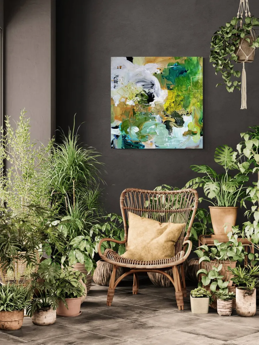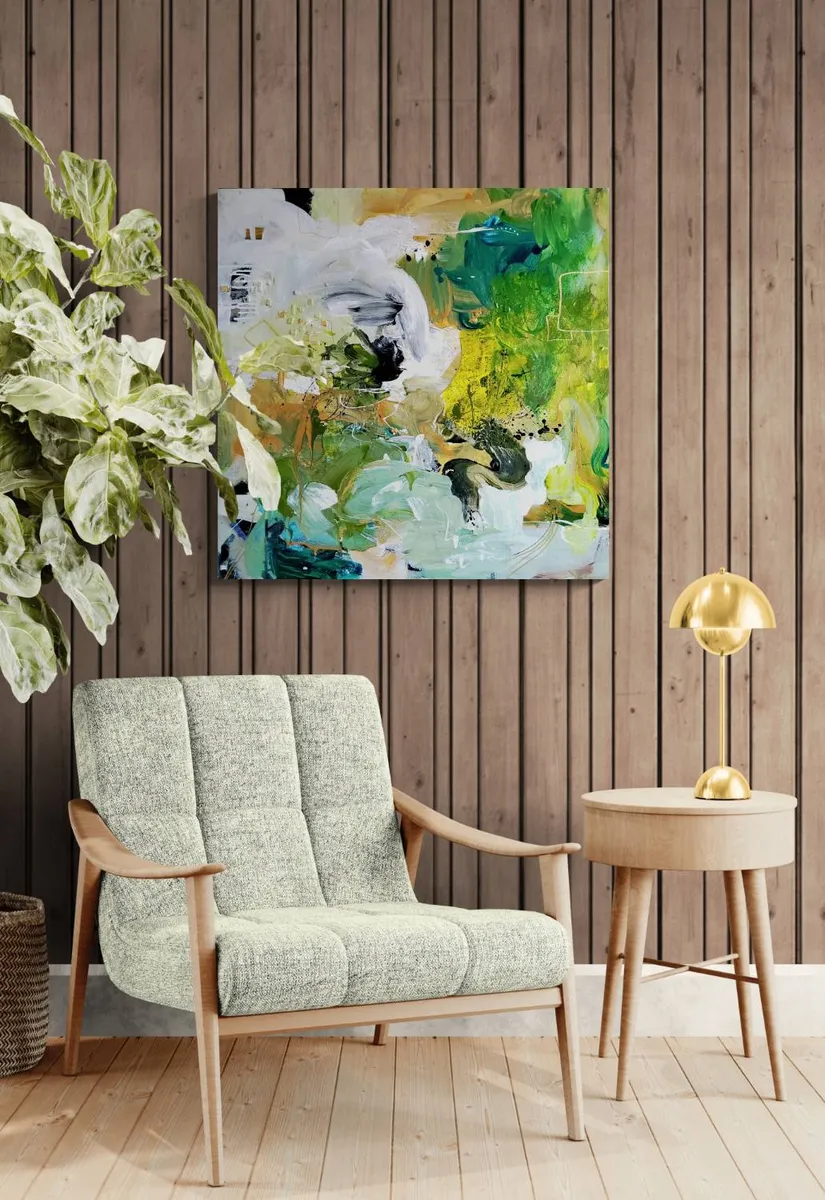 Professionelle malemedier på kvalitetslærred. Et maleri med struktur lavet med teknikken vådt-i-vådt. Detaljer i guld reflekterer lyset og understreger varmen i maleriet. Kanten er malet sort og kan enten gemmes i en ramme eller fungere som en ramme i sig selv. Signatur i guld