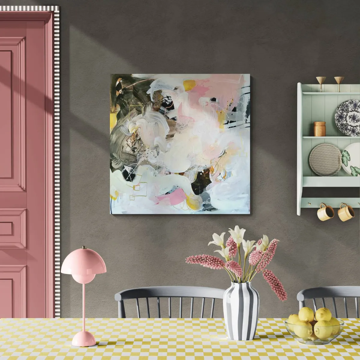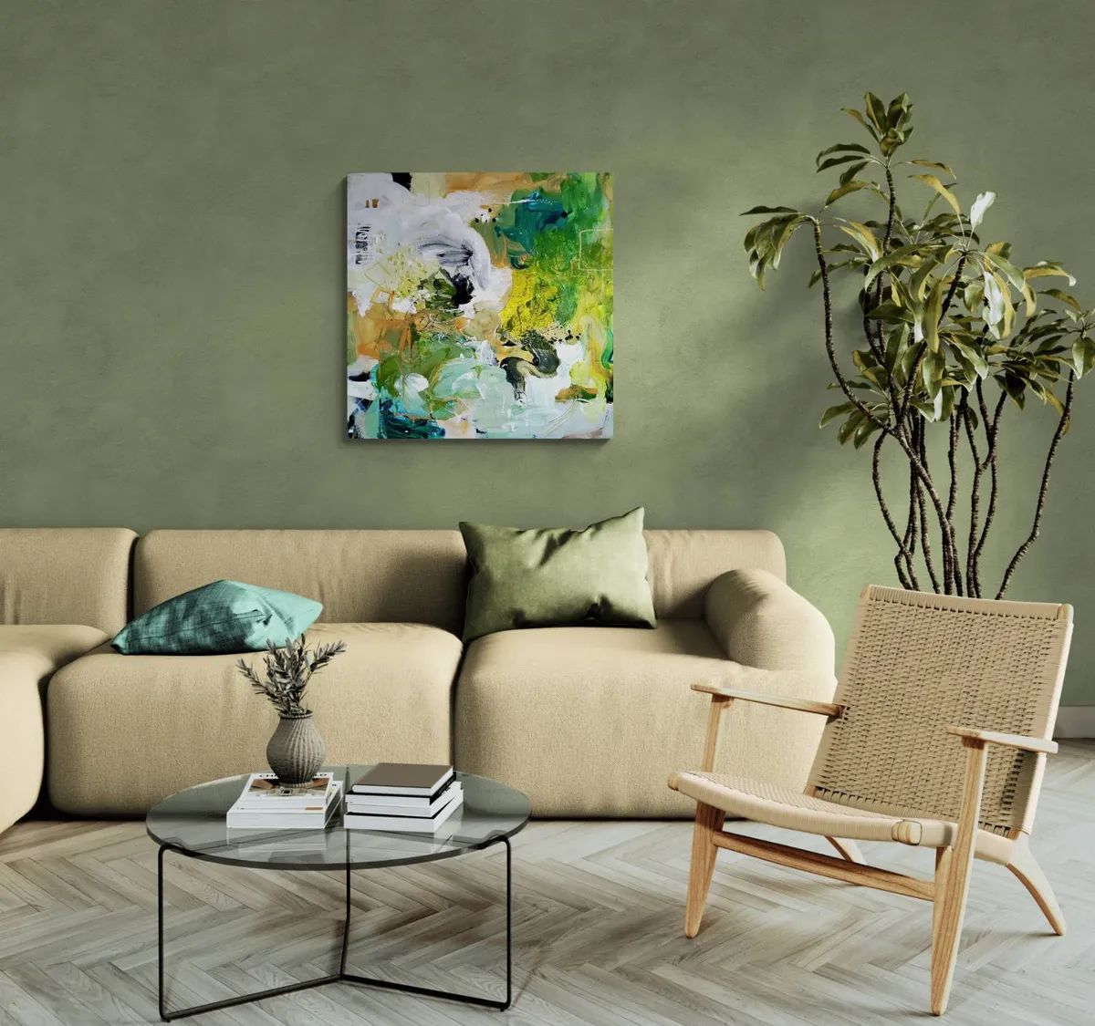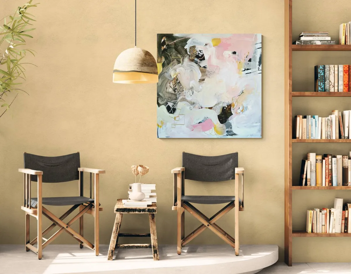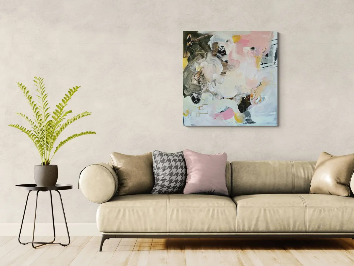 Professionelle malemedier på kvalitetslærred. Et maleri med struktur lavet med teknikken vådt-i-vådt. Detaljer i guld reflekterer lyset og understreger varmen i maleriet. Kanten er malet sort og kan enten gemmes i en ramme eller fungere som en ramme i sig selv. Signatur i guld